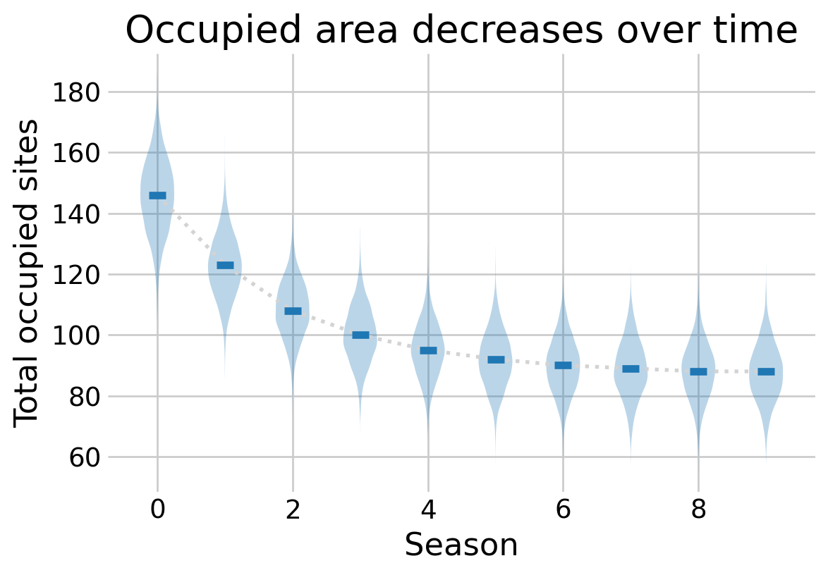 We can recover the latent \(z_{i,j}\) states with the Predictive class in NumPyro. This allows us to generate posterior predictive samples given the detection data. In this case, we may want to know the total number of occupied sites throughout the study.