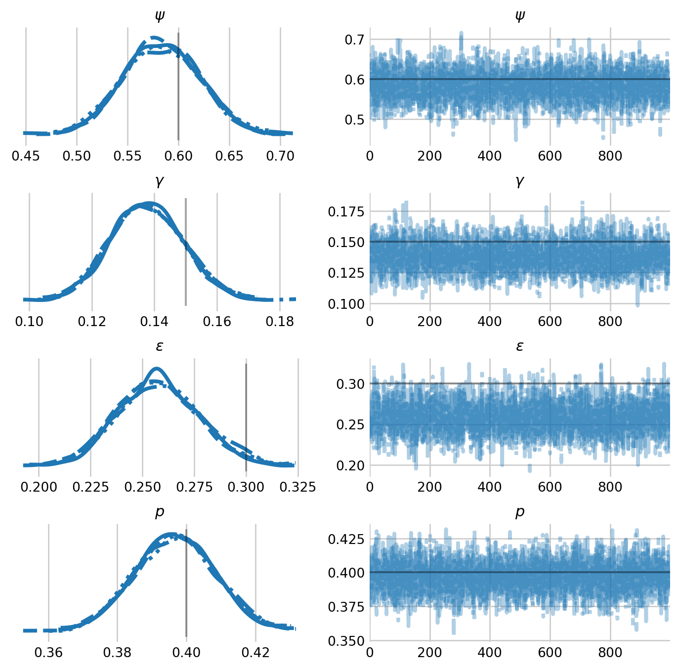 We see that the model model recovers parameters well. While \(\epsilon\) is underestimated, I suspect that this is simply a function of Monte Carlo error.