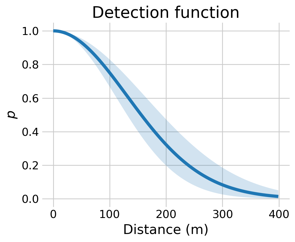 Figure 5: Posterior distribution for the detection function. The line represents the posterior mean while the shaded area is the 96% interval.