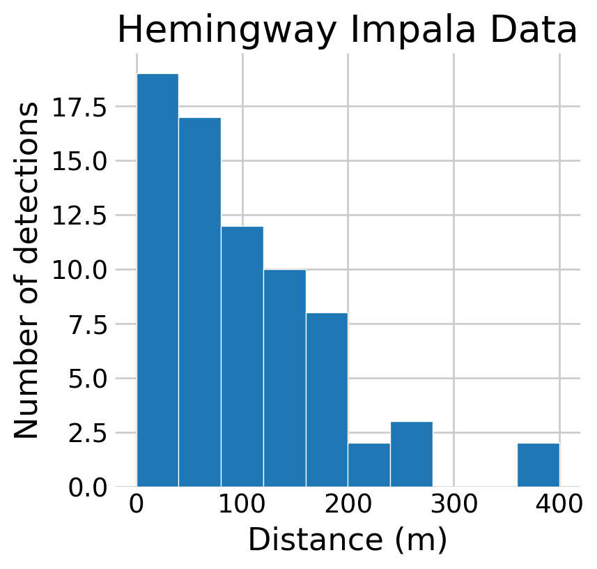 Figure 1: Histogram of the number of detected impalas at varying distances.