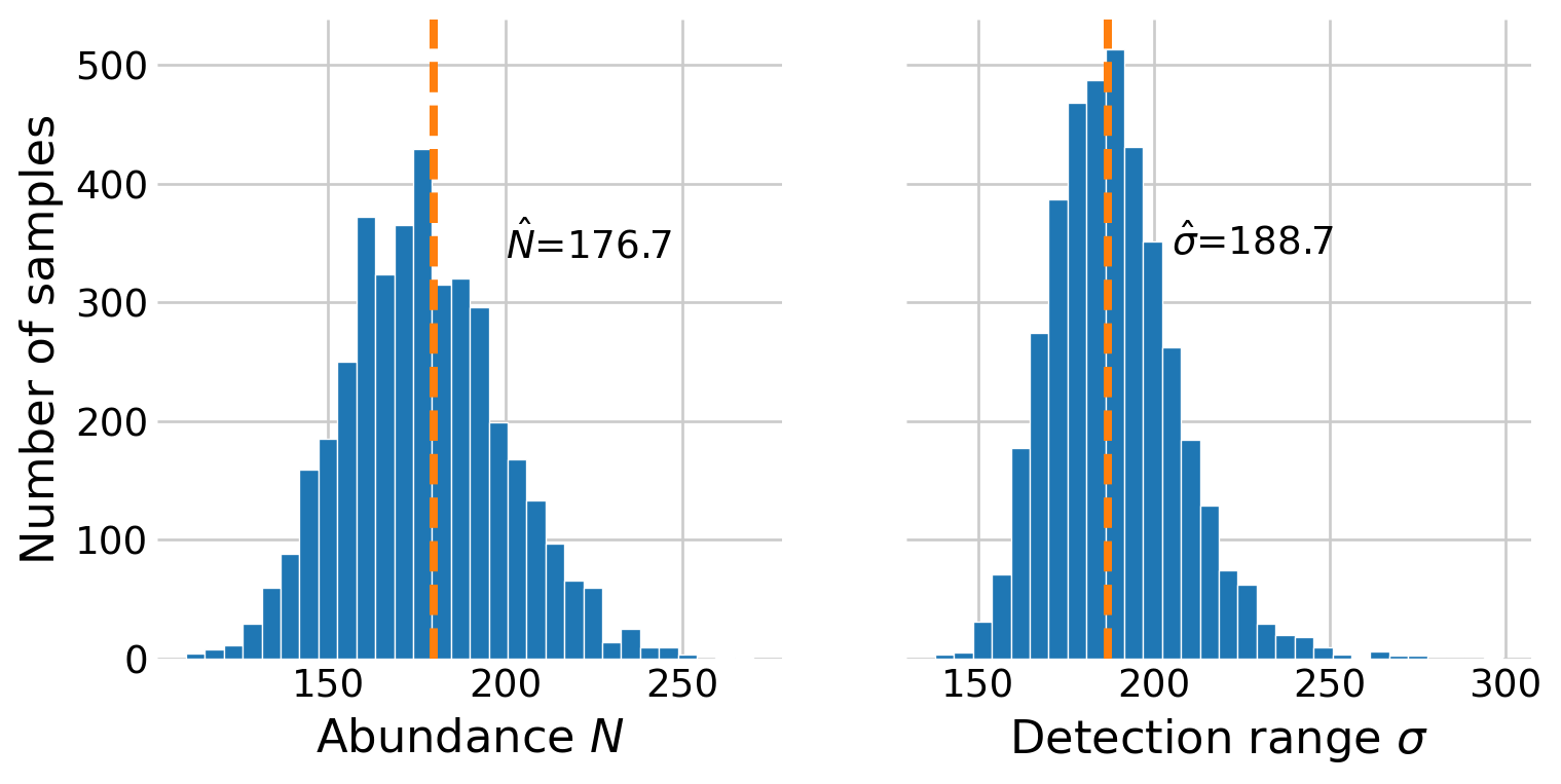 # plot the posterior distributionssigma_samples = posterior.sigma.to_numpy()fig, (ax0, ax1) = plt.subplots(1, 2, sharey=True, figsize=(8,4))# histograms of the posteriorsax0.hist(N_samples, edgecolor='white', bins=30)ax1.hist(sigma_samples, edgecolor='white', bins=30)# axes labelsax0.set_xlabel(r'Abundance $N$')ax0.set_ylabel('Number of samples')ax1.set_xlabel(r'Detection range $\sigma$')# add the point estimatesN_hat = N_samples.mean()sigma_hat = sigma_samples.mean()ax0.text(200, 350, rf'$\hat{{N}}$={N_hat:.1f}', ha='left', va='center')ax1.text(205, 350, rf'$\hat{{\sigma}}$={sigma_hat:.1f}', ha='left', va='center')# the results from royle and dorazio (2008) for comparisonN_hat_royle =179.9sigma_hat_royle =187ax0.axvline(N_hat_royle, linestyle='--', linewidth=3, color='C1')ax1.axvline(sigma_hat_royle, linestyle='--', linewidth=3, color='C1')plt.show()