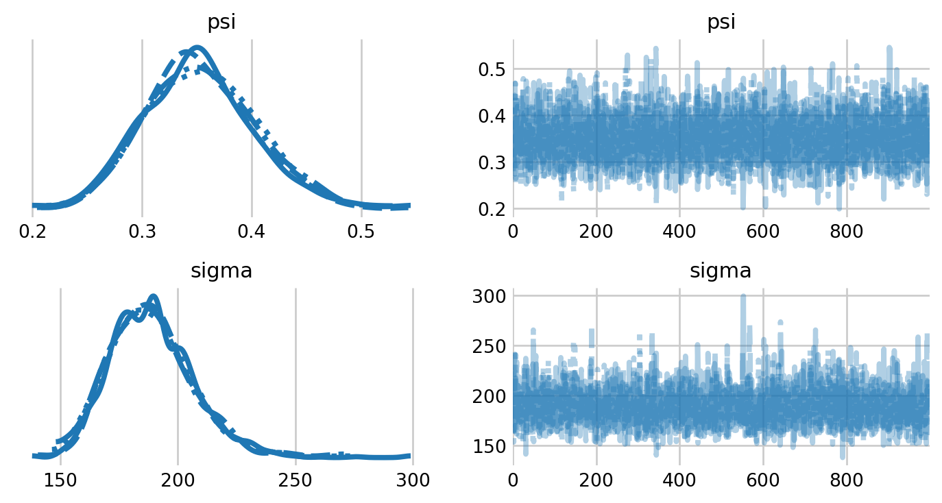 This model samples slower than the models in the other notebooks, presumably because of the unobserved \(x.\) As in the closed capture-recapture notebook, we will have to simulate the posterior for \(N\) using the posterior distribution of \(\psi\) and \(M.\)