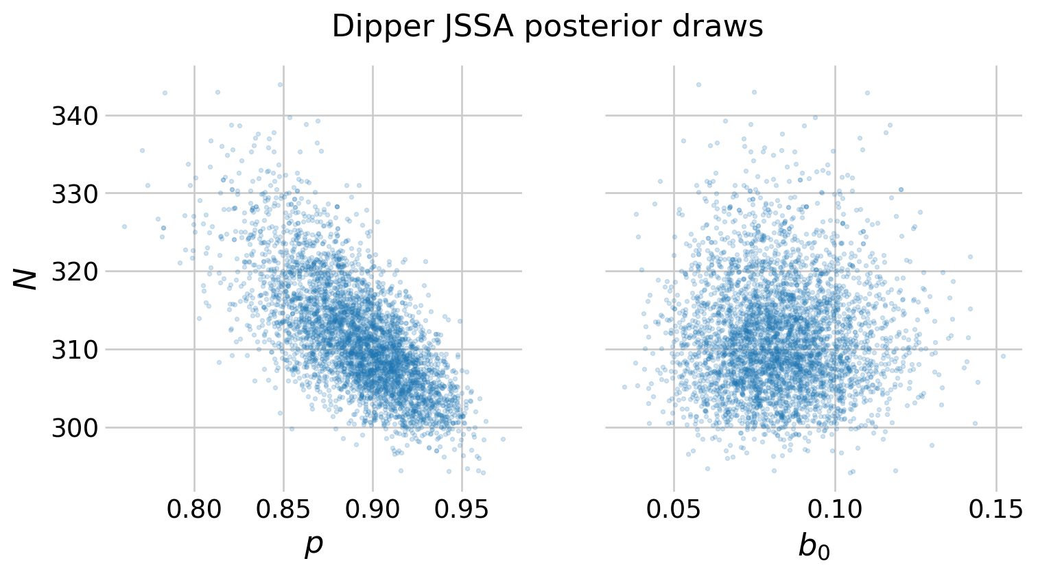 Figure 4: Posterior draws of \(N,\)\(b_0,\) and \(p\) from the dipper JSSA model.