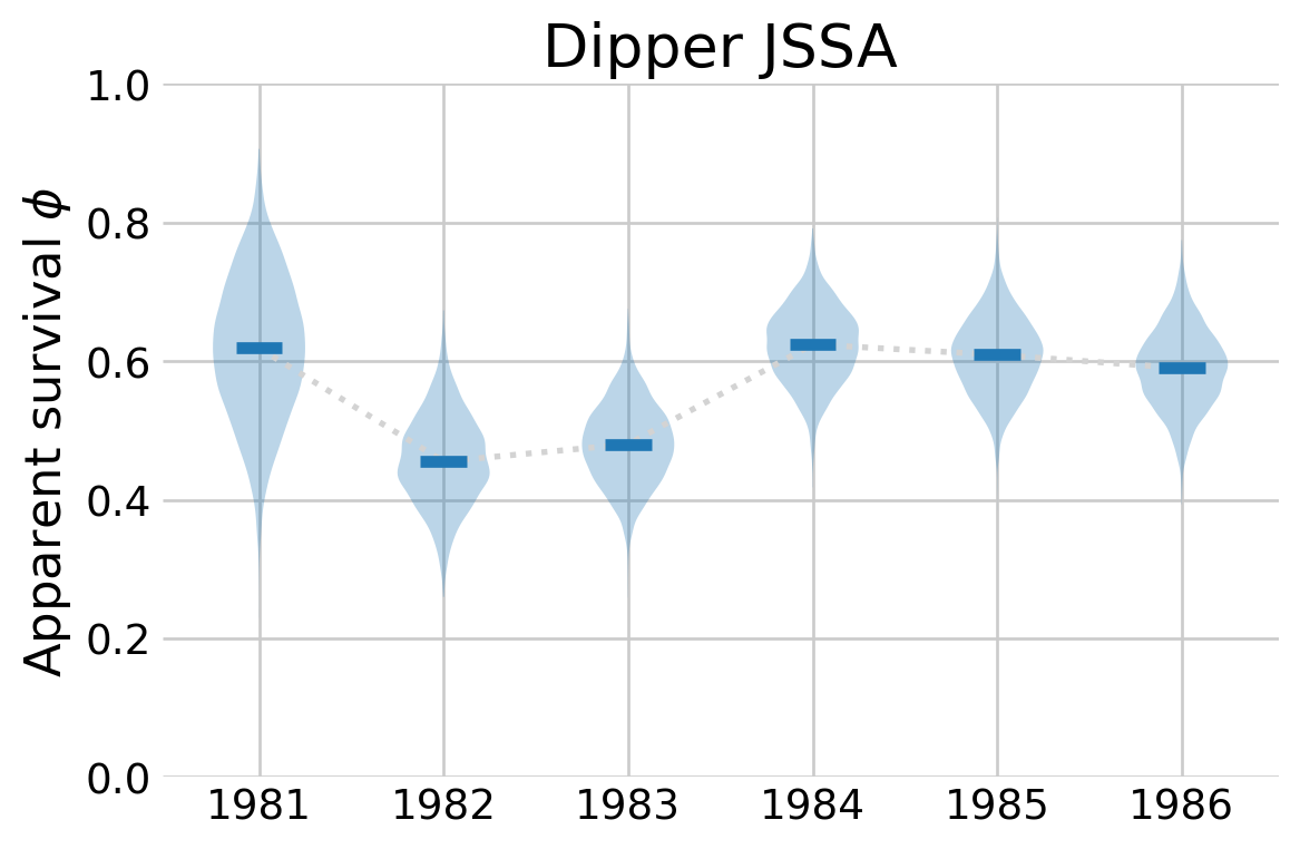 Figure 3: Violin plots of the posterior for apparent surival over time from the cormorant CJS. Horizontal lines represent the posterior median.