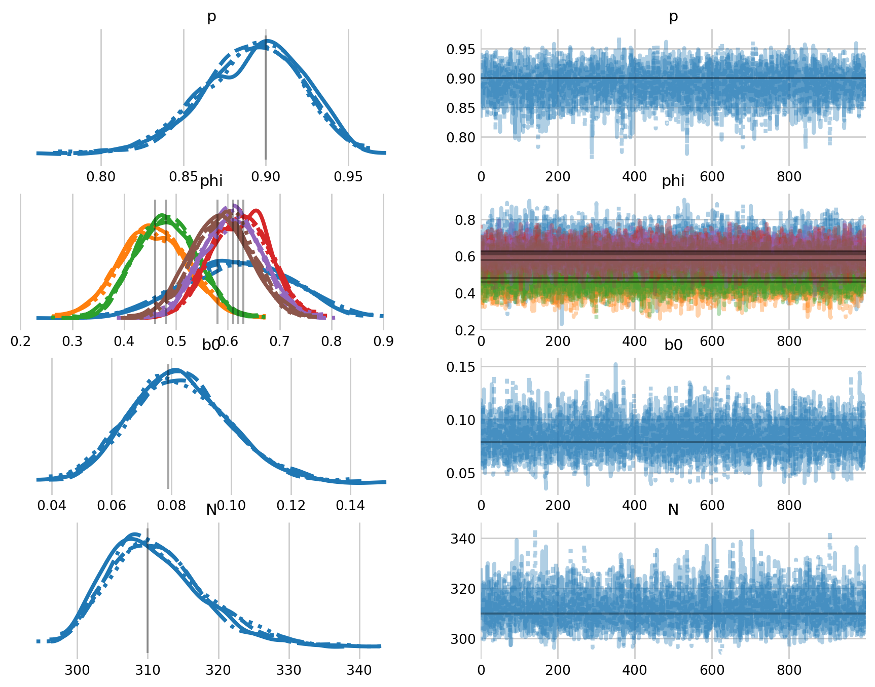 The traceplots include the maximum likelihood estimates from the model, which I estimated usingthe openCR package in R. Again, there is high level of agreement between the two methods. I plot the survival estimates over time, and the posterior draws of \(N\), \(p\), and \(b\).