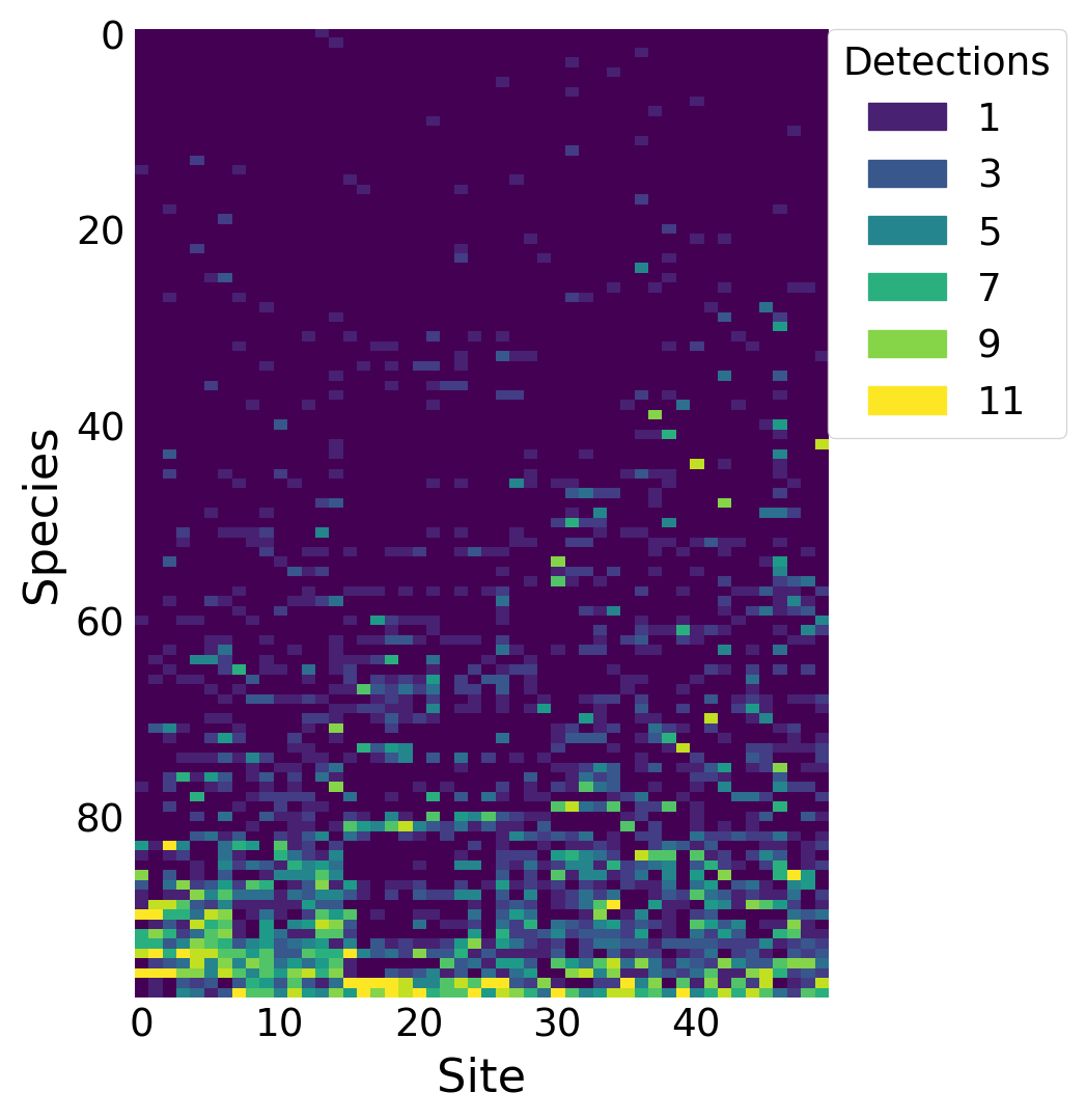 %config InlineBackend.figure_format ='retina'from matplotlib.patches import Patchfrom scipy.stats import binomimport arviz as azimport matplotlib.pyplot as pltimport numpy as npimport pandas as pdimport pymc as pmimport seaborn as sns# only necessary on MacOS Sequoia# https://discourse.pymc.io/t/pytensor-fails-to-compile-model-after-upgrading-to-mac-os-15-4/16796/5import pytensorpytensor.config.cxx ='/usr/bin/clang++'SEED =808RNG = np.random.default_rng(SEED)plt.style.use('fivethirtyeight')plt.rcParams['axes.facecolor'] ='white'plt.rcParams['figure.facecolor'] ='white'plt.rcParams['axes.spines.left'] =Falseplt.rcParams['axes.spines.right'] =Falseplt.rcParams['axes.spines.top'] =Falseplt.rcParams['axes.spines.bottom'] =Falsesns.set_palette("tab10")def invlogit(x):return1/ (1+ np.exp(-x))# read in the detection datanh17 = pd.read_csv('detectionFreq.NH17.csv')Y = nh17.to_numpy()n, J = Y.shapeK = Y.max()# convert the species names to intsspecies_idx, lookup = nh17.index.factorize() # lookup[int] returns the actual name# plot the detection frequenciesfig, ax = plt.subplots(figsize=(4, 6))im = ax.imshow(Y[np.argsort(Y.sum(axis=1))], aspect='auto')ax.set_ylabel('Species')ax.set_xlabel('Site')# add a legendvalues = np.unique(Y.ravel())[1::2]colors = [ im.cmap(im.norm(value)) for value in values]patches = [ Patch(color=colors[i], label=f'{v}') for i, v inenumerate(values) ]plt.legend(title='Detections', handles=patches, bbox_to_anchor=(1, 1), loc=2, borderaxespad=0.)ax.grid(False)plt.show()