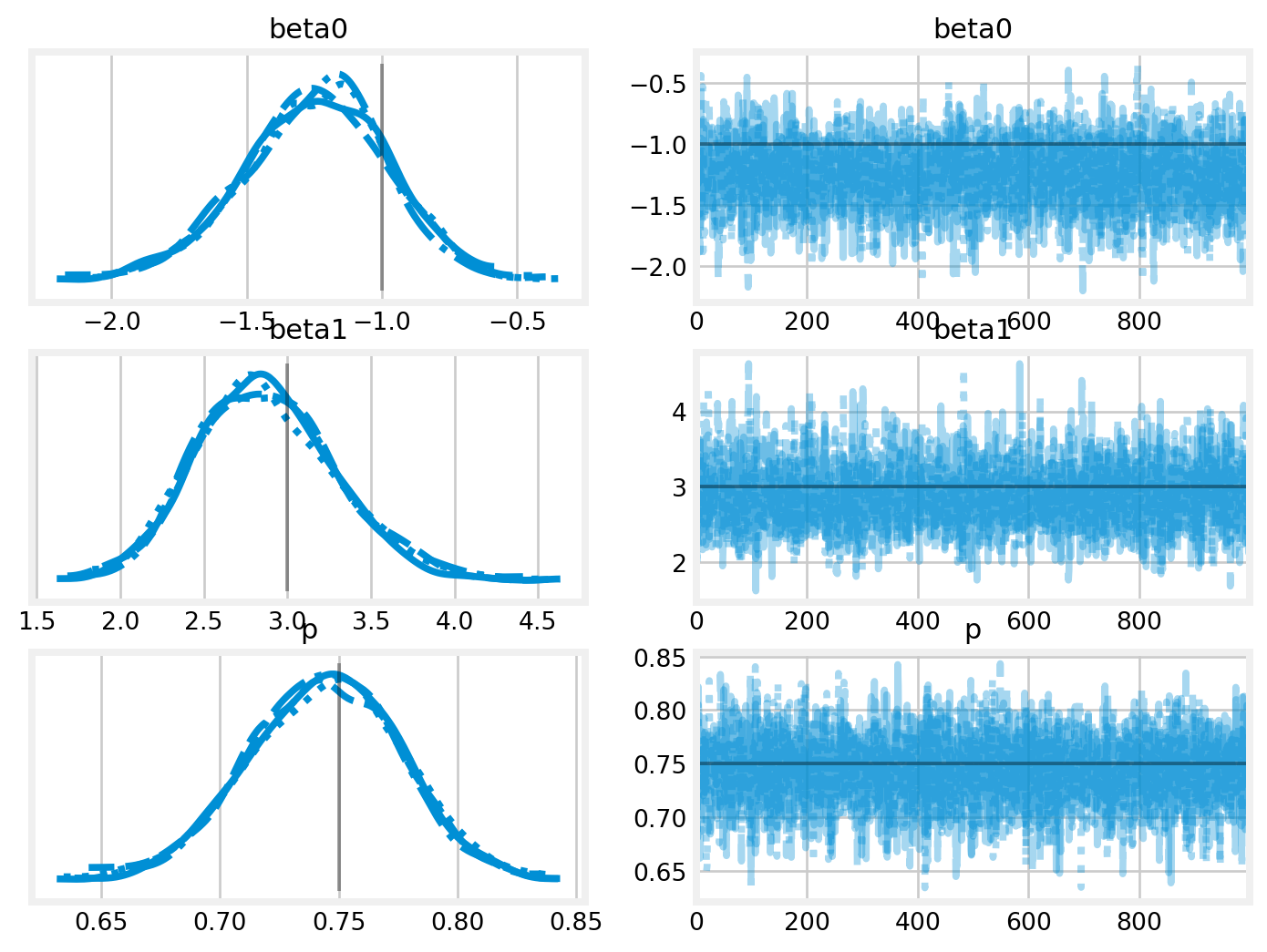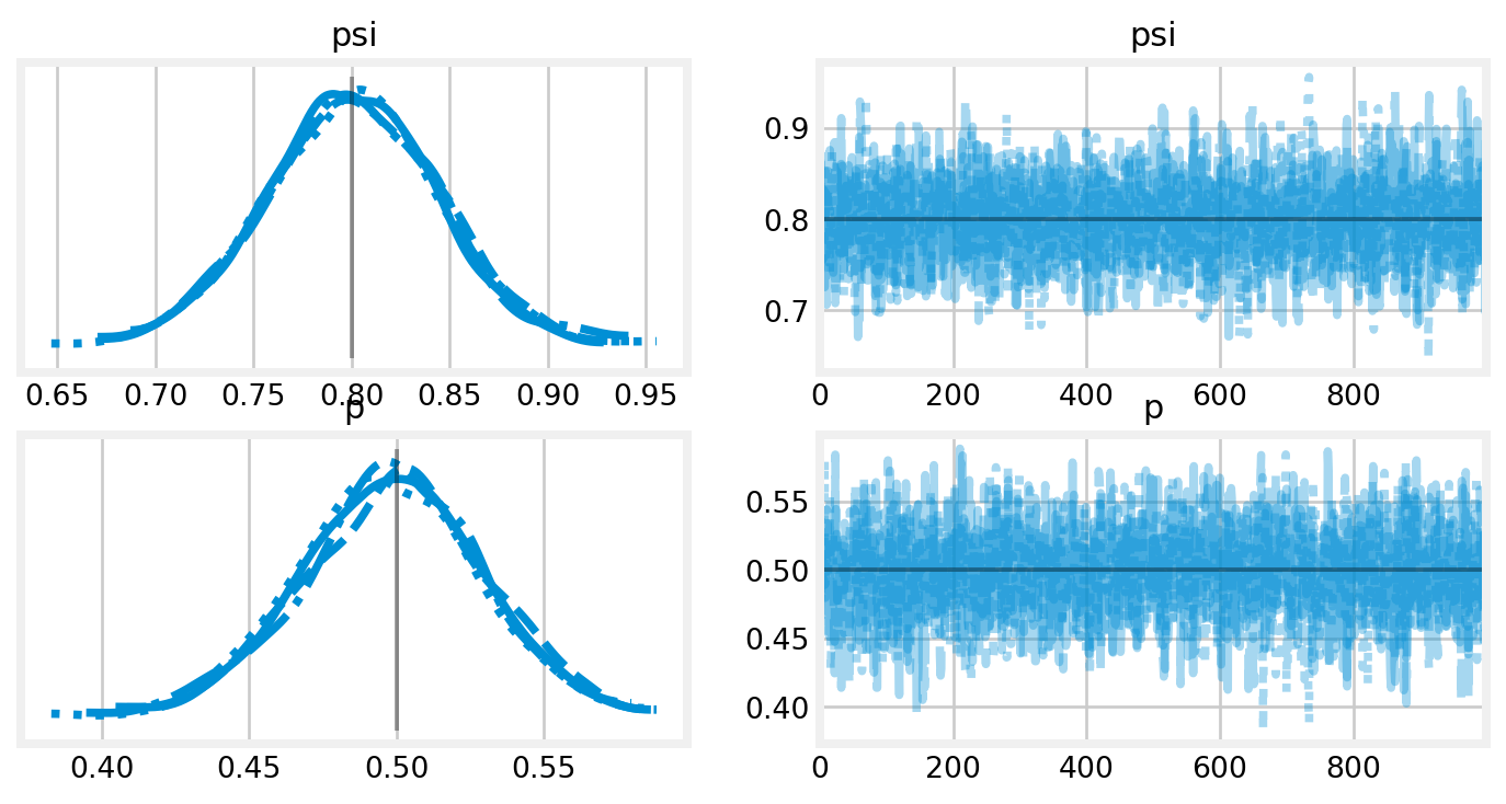 PyMC will try to use the No-U-Turn Sampler (NUTS) whenever possible. As you can see, it samples the posterior quickly. I can plot the output using the az.plot_trace(), supplying the true values for \(p\) and \(\psi\) for comparison. I can also look at a tabular summary using az.summary().