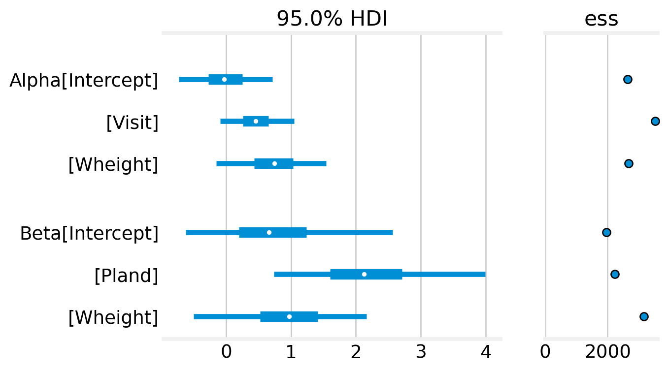 Figure 8: Forest plots from willow warbler occupancy model. ESS refers to the effective sample size.