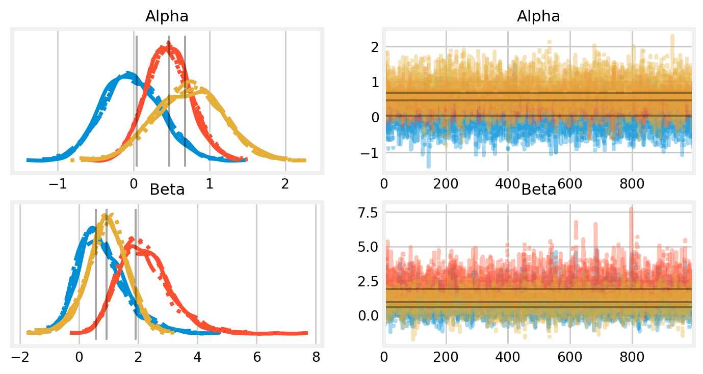This example uses an extremely handy feature of PyMC: coordinates. This allows us to specify a prior for each \(\alpha\) and \(\beta\) value in one line of code, using the dims argument in our prior distribution. The length of vector is implied by length of the list in coords.