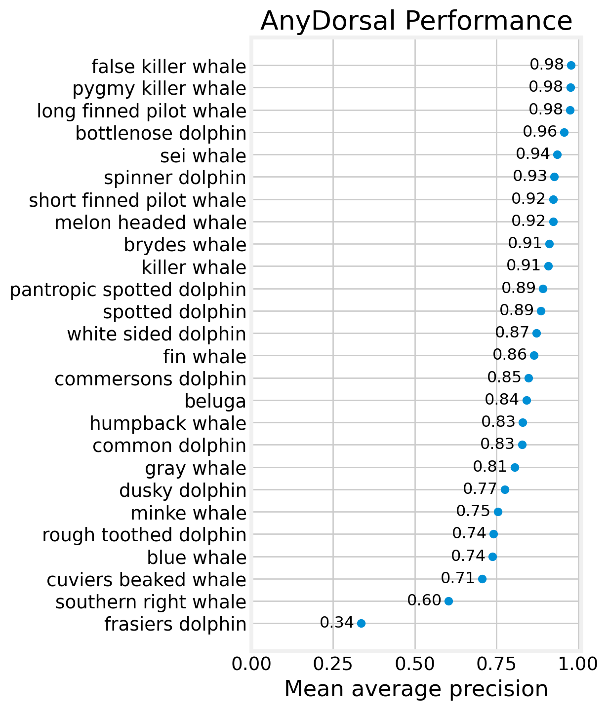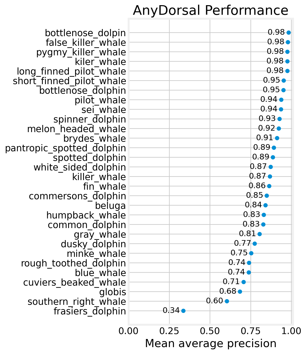 In this notebook, we’ll demonstrate how do evaluate AnyDorsal’s’ performance on a test dataset. We’ll use the Happy Whale and Dolphin Kaggle competition dataset as an example. You can download the data by following that linked page (click the big “Download all” button). FYI, you’ll have to create an account first.
