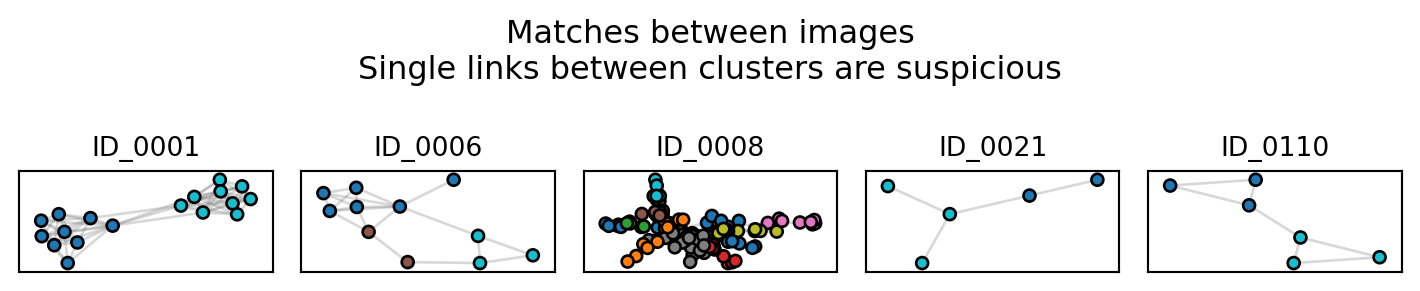 In an ideal world, every image of the same individual would be connected in the network, and not connected to images of any other individuals. As such, the ideal network would look like a bunch of blobs. As such, we might be suspicious of clusters that look like barbells, i.e., two blobs connected by one link. That one link might be a false positive, linking two distinct identities. The plot_suspicious function plots things that might look like barbells.