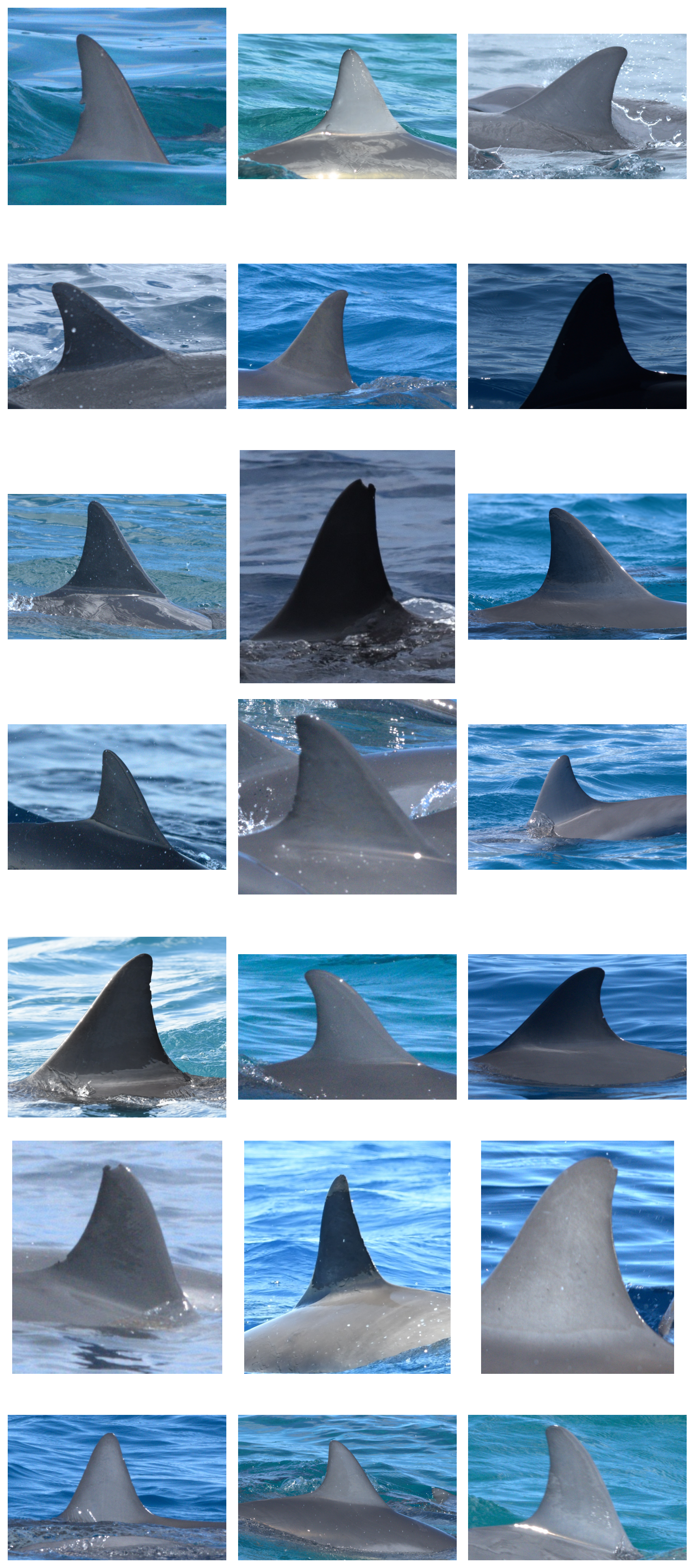 The images in this example were collected during a multi-year photo-ID survey of spinner dolphins in Hawaiʻi. Every image collected during the study was graded for quality and distinctiveness. This example dataset only includes images of sufficient quality that have been cropped to the identifying mark—the dorsal fin. This example includes 208 images of animals without distinctive markings, and 1043 images of animals with distinctive markings.