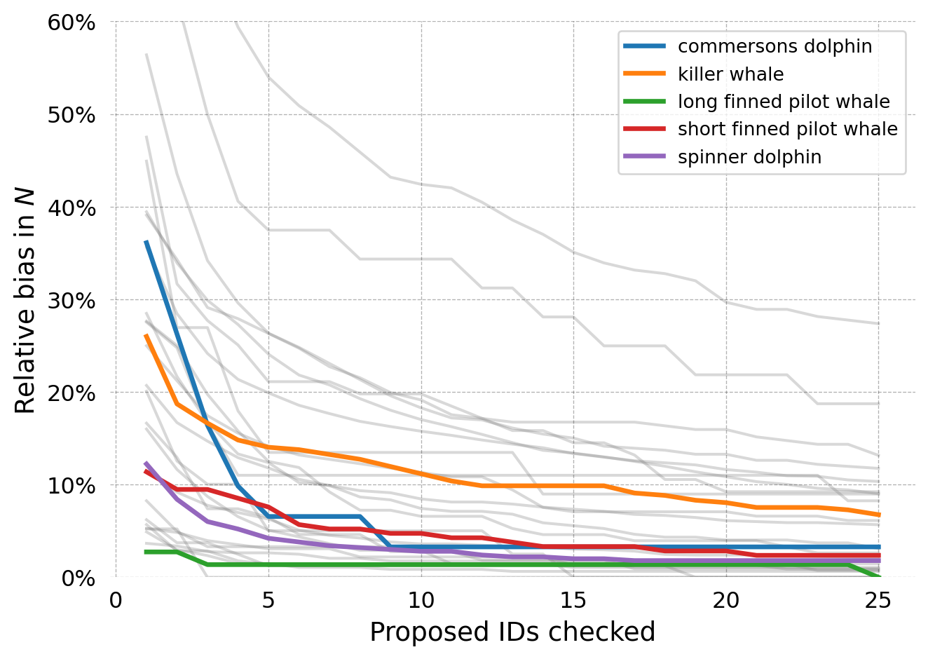 We can see that most species get below 10% once we’ve checked up to 10 proposed matches. In fact, 26 of the 39 datasets achieved a relative bias less than 10% at 10 proposed matches (Patton et al. 2025).